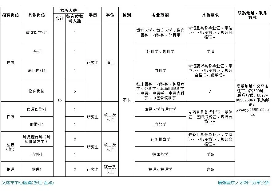 6.其他条件和要求详见《义乌市中心医院面向2026届毕业生校园招聘计划表》(附件1)。