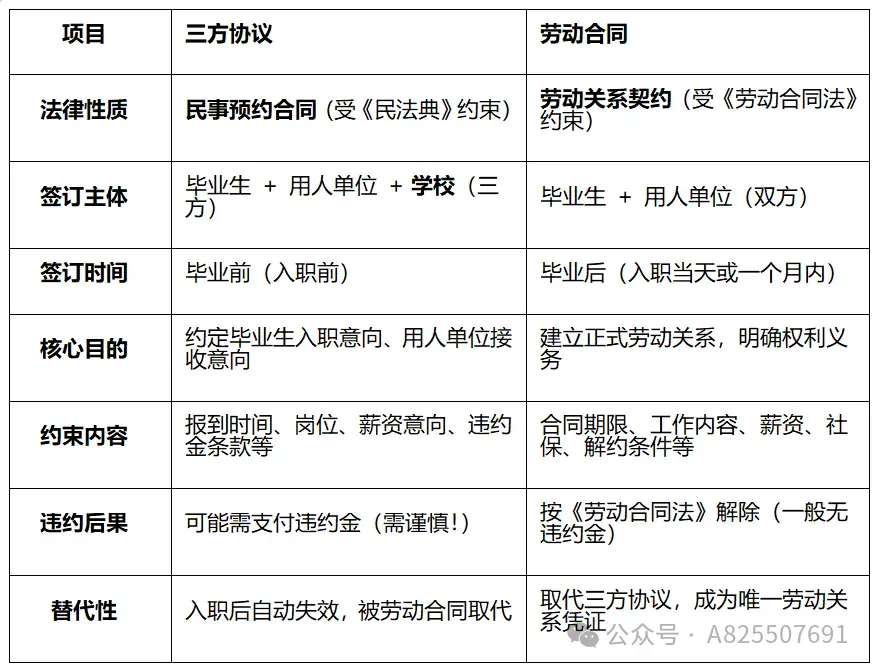 关于校园招聘中“三方协议”与“劳动合同”的区别,以及签约后对应届生身份的影响,是毕业生必须清楚的核心问题。以下是详细解析: