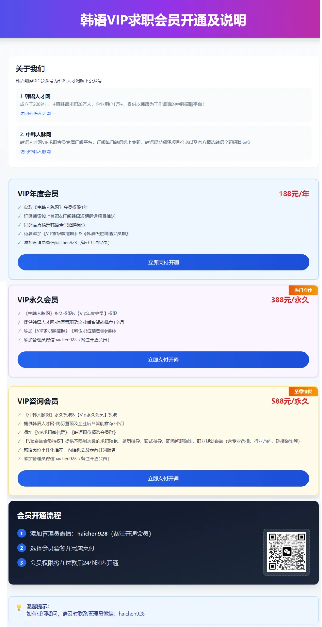 VIP年度会员188元/年 ✓获取《中韩人脉网》会员权限1年 ✓订阅韩语线上兼职&订阅韩语短期翻译项目推送 ✓订阅官方精选韩语全职招聘岗位 ✓免费添加《VIP求职微信群》&《韩语职位精选会员群》 | VIP永久会员388元/永久 ✓《中韩人脉网》永久权限 ✓【Vip年度会员】权限 ✓提供韩语人才网-简历置顶及企业后台智能推荐1个月 ✓添加《VIP求职微信群》《韩语职位精选会员群》 | VIP咨询会员588元/永久 ✓《VIP永久会员》所有权限; ✓【Vip咨询会员特权】提供不限制次数的求职陪跑,简历指导,面试指导,职场问题咨询,职业规划咨询(含专业选择,行业方向,跳槽咨询等) ✓韩语岗位个性化推荐,内推机会及定向订阅服务 |