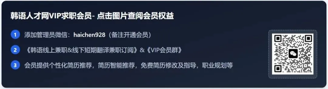 《韩语VIP求职会员》 每日韩语兼职&官方精选韩语全职订阅&免费面试,简历,跳槽等求职指导&名企内推机会&免费职业规划; 1.《中韩人脉网》专属会员平台每日韩语兼职&官方精选韩语圈子订阅。 2.《韩语人才网官网》简历置顶及简历智能推送。 3.免费面试,简历,跳槽等求职指导&名企内推机会&免费职业规划; 添加管理员微信haichen928(开通会员) |
