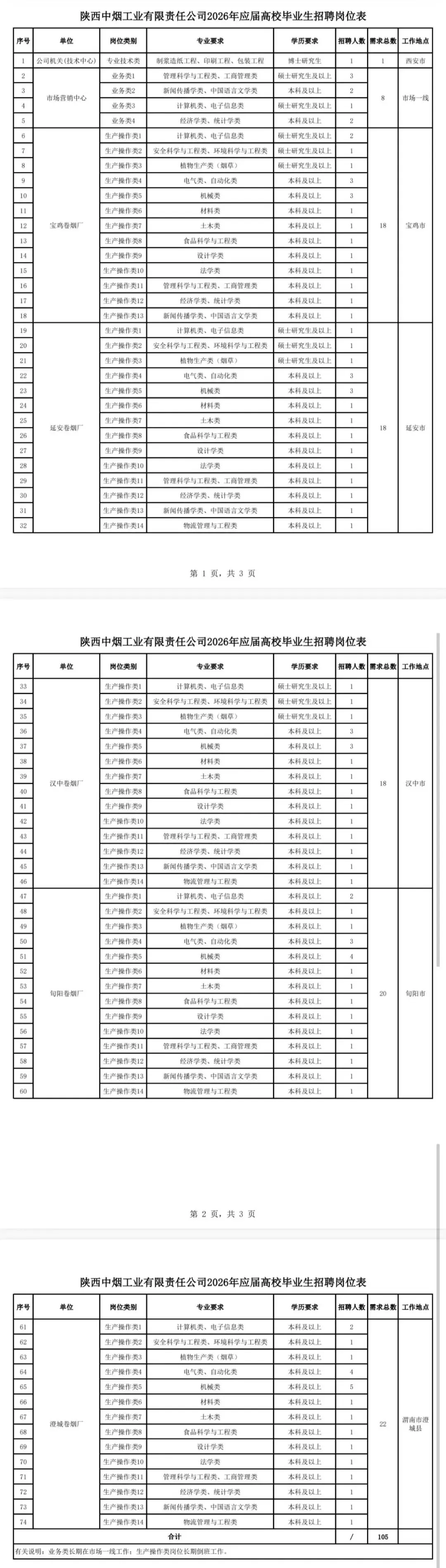 招聘岗位为公司机关技术中心专业技术类、市场营销中心业务类及5家卷烟厂生产操作类,共招聘105人(详见附件1《陕西中烟工业有限责任公司2026年应届高校毕业生招聘岗位表》)。
