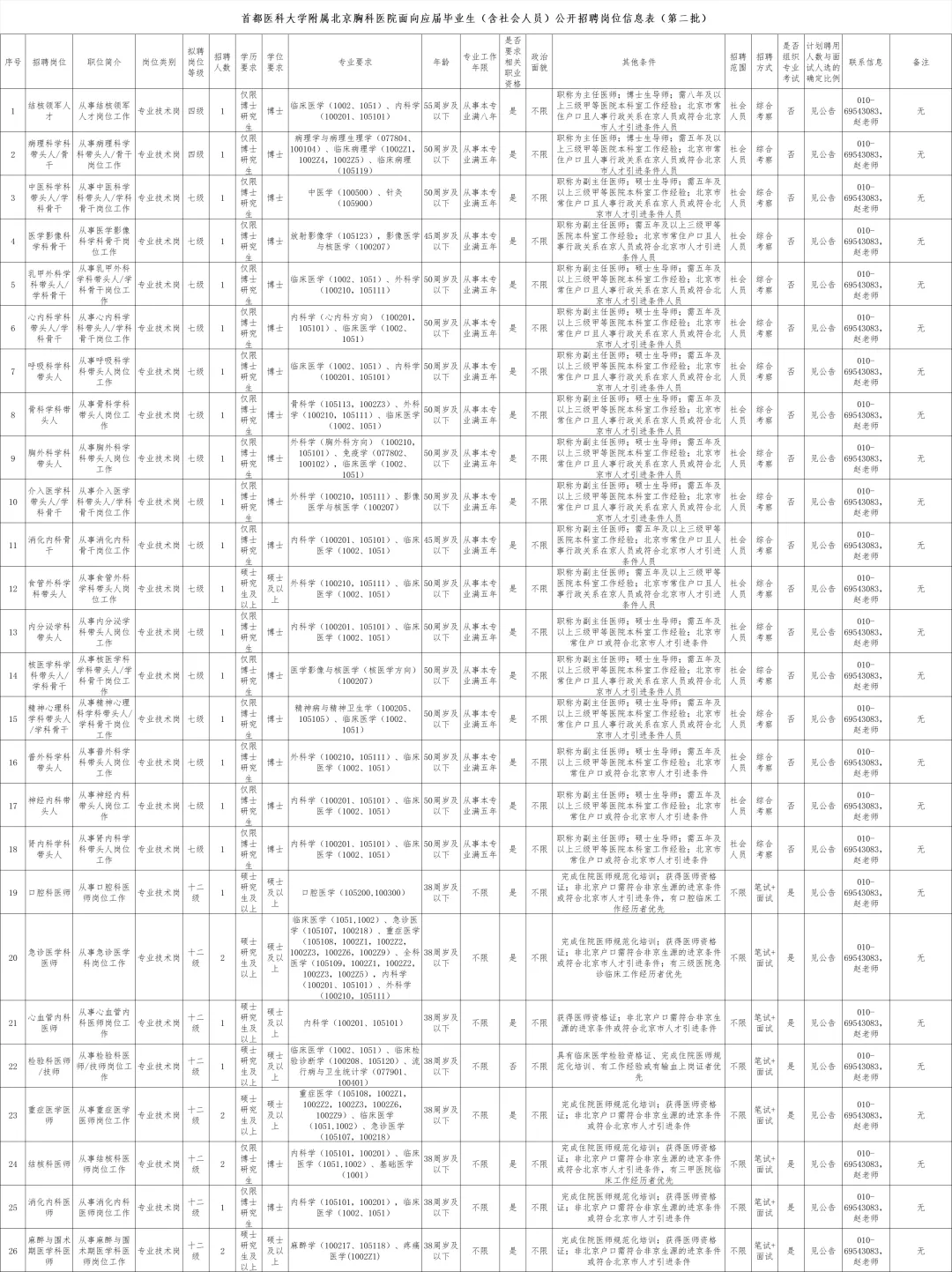 首都医科大学附属北京胸科医院面向应届毕业生(含社会人员)公开招聘岗位信息表(第二批).xlsx