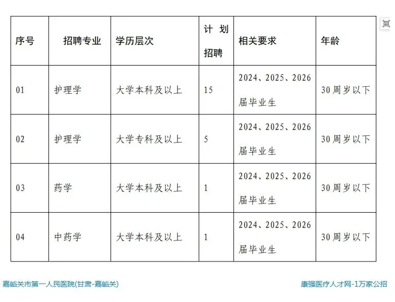 4.岗位所需要的其他条件,详见《嘉峪关市第一人民医院2026年春季公开招聘聘用制专业技术人员岗位简表》(附件1)。