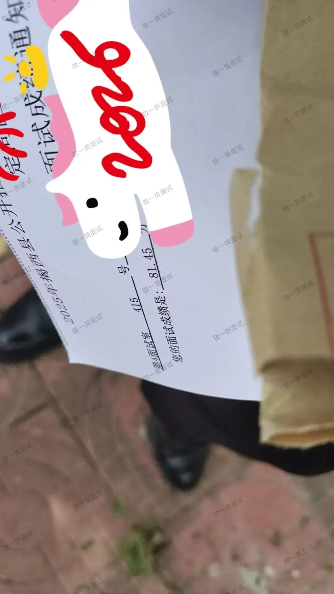 2.面试成绩:面试采用结构化面试方式,满分为100分,面试合格分数线为60分。面试成绩按四舍五入保留小数点后2位。面试成绩在候分室向应聘人员公布,并由应聘人员在面试成绩单上签名确认。