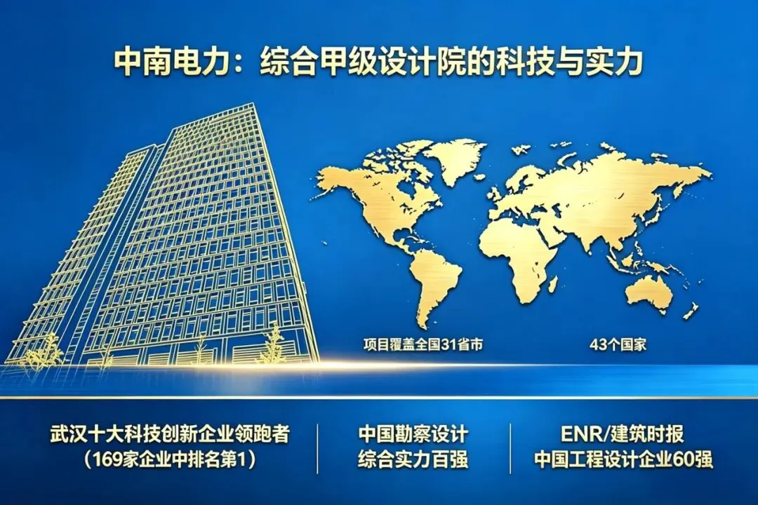 中南电力作为综合甲级设计院,荣获“武汉十大科技创新企业领跑者"称号,在169家企业中排名第1。勘察设计的项目遍布全国31个省市自治区和43个国家,连续多年位居中国勘察设计综合实力百强、ENR/建筑时报“中国工程设计企业60强”行列。
