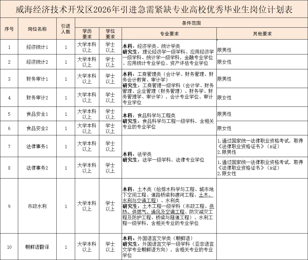 2026年威海经济技术开发区引进急需紧缺专业高校优秀毕业生公告(10人)为进一步优化威海经济技术开发区干部队伍结构,加强优秀年轻干部人才储备,现面向国内普通高校引进一批2026年优秀应届毕业生到威海经济技术开发区区直有关部门工作。现将有关事项公告如下: