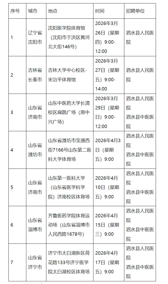 泗水人民医院 泗水中医院招聘应届毕业生啦,截至4月17日。招聘计划:4月15日,地点齐鲁医药学院体育运动场(山东省淄博市人民西路1678号); 4月17日,地点济宁医学院太白湖校区体育场(济宁市太白湖新区荷花路133号)。2026年泗水县卫生健康系统“校园双选会”公告