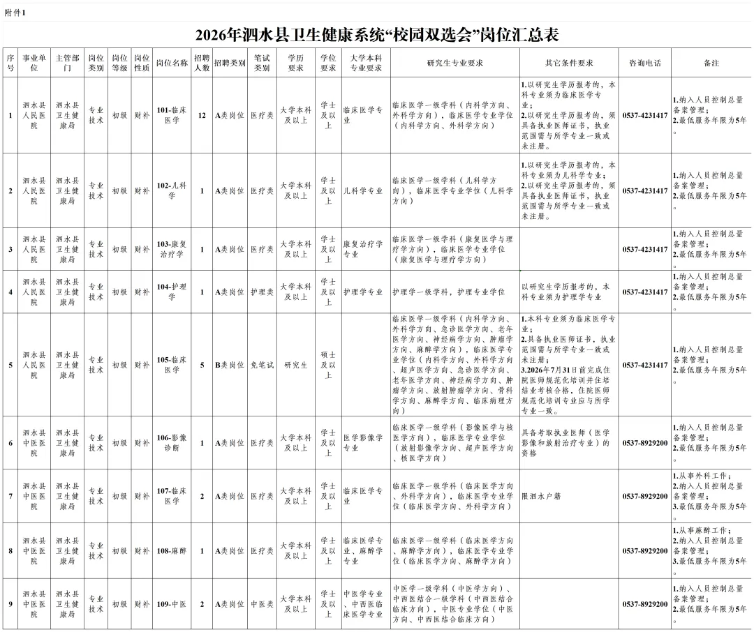 1、2026年泗水县卫生健康系统“校园双选会”公告岗位汇总表